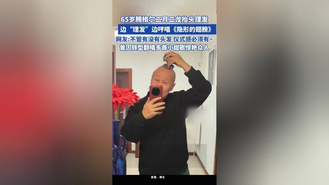 这段15秒的视频里,腾格尔全程憋着笑,一边配合理发师“表演”理发,一边还哼起了改编版《隐形的翅膀》:“每一次,都在光秃秃的头皮上飞翔~”魔性的旋律配上他一本正经的表情,瞬间戳中网友笑点。有粉丝翻出他早年留长发的照片对比,调侃道:“当年草原歌王的飘逸长发去哪了?这光头亮得能当镜子照了!”还有人玩梗:“建议改名叫‘腾格尔·没头发·格尔’,二月二剃光头,这仪式感拉满了。”